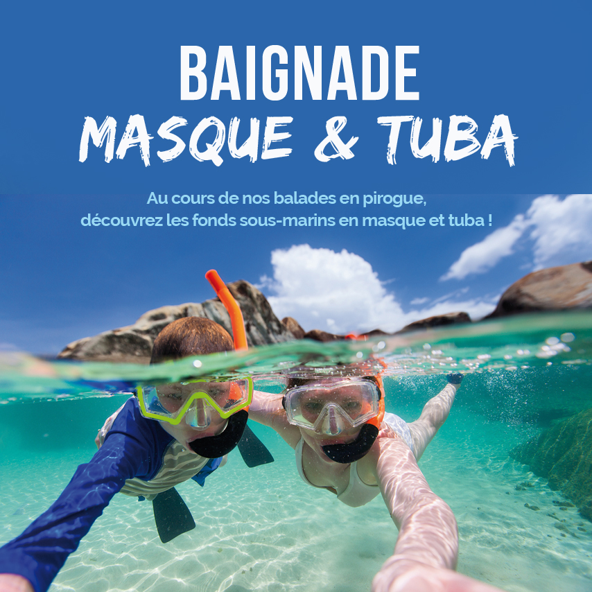 En pirogue nous pagayons mais surtout ….. nous nous baignons ! Au cours de nos balades vous passerez la moitié du temps dans l’eau et l’autre moitié à bord des pirogues pour vous rendre aux différents spots. Dans des criques, sur des plages ou au-dessus de récifs vous aurez tout le loisir d’observer la vie sous-marine avec un masque et un tuba. Pensez à apporter votre équipement sinon nous mettons du matériel à disposition gratuitement !